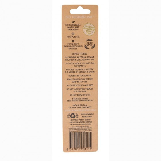 Deze bio tandenborstel heeft een handvat gemaakt van maïszetmeel en zachte recycleerbare nylon haartjes, vrij van bpa en pvc. De verpakking is gemaakt van gerecycleerd karton en bioplastic op basis van maïszetmeel.